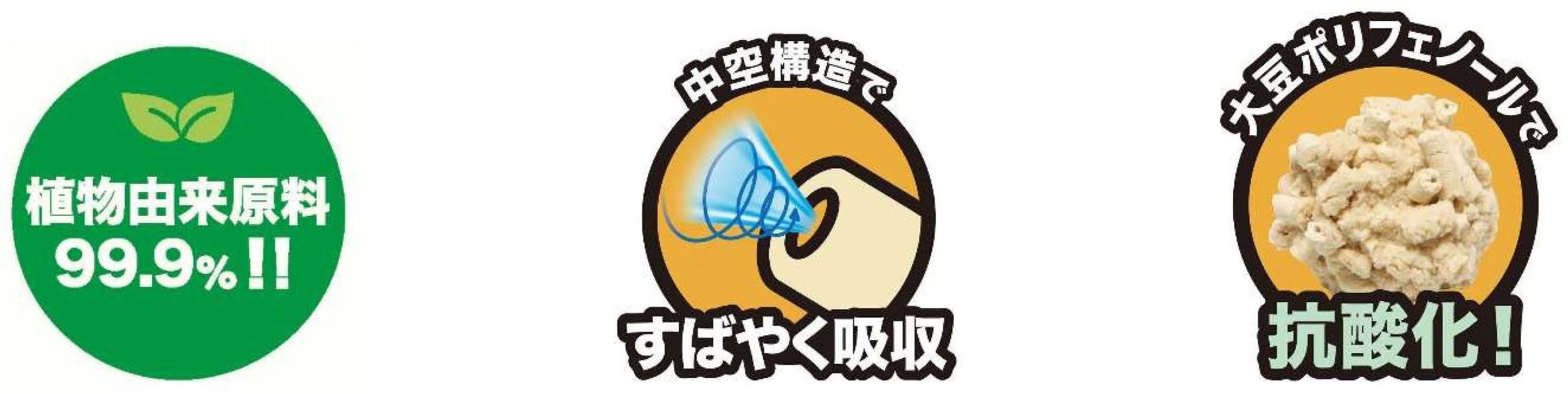具体的には、『ネオ砂おから オーガニック』の特殊な構造、おからに含まれている大豆ポリフェノールによる抗酸化作用、植物由来原料99.9%使用をパッケージ前面にイラストを用いて掲載することで、商品の機能・特長を分かりやすく表現しました。また、パッケージは、白をベースに従来品「ネオ砂おから」のオレンジを使用して、従来のイメージを継承しながら、より上質さと新しさを強調しています。